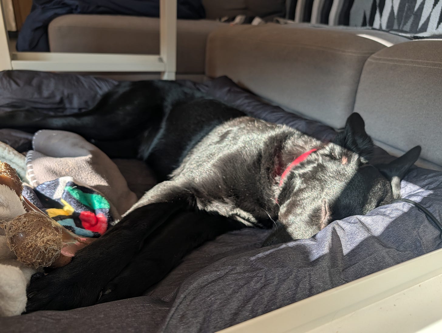 Kenji has a “place” command to stay in his dog bed in the living room. Before, he’d creep his legs off the edge.